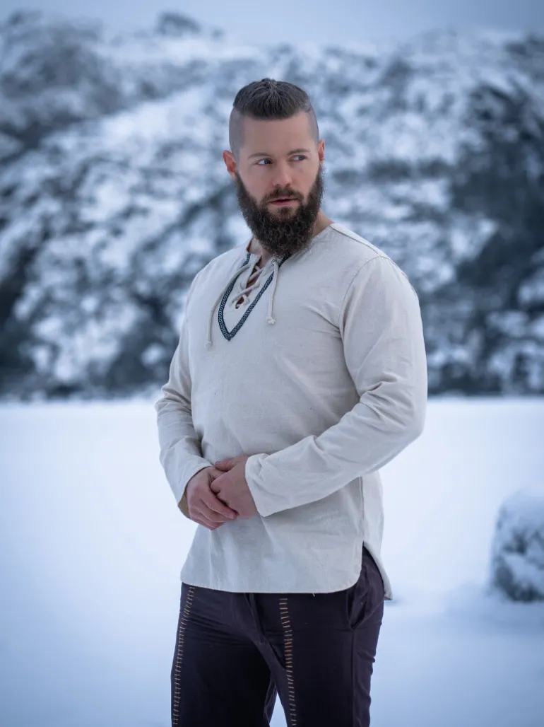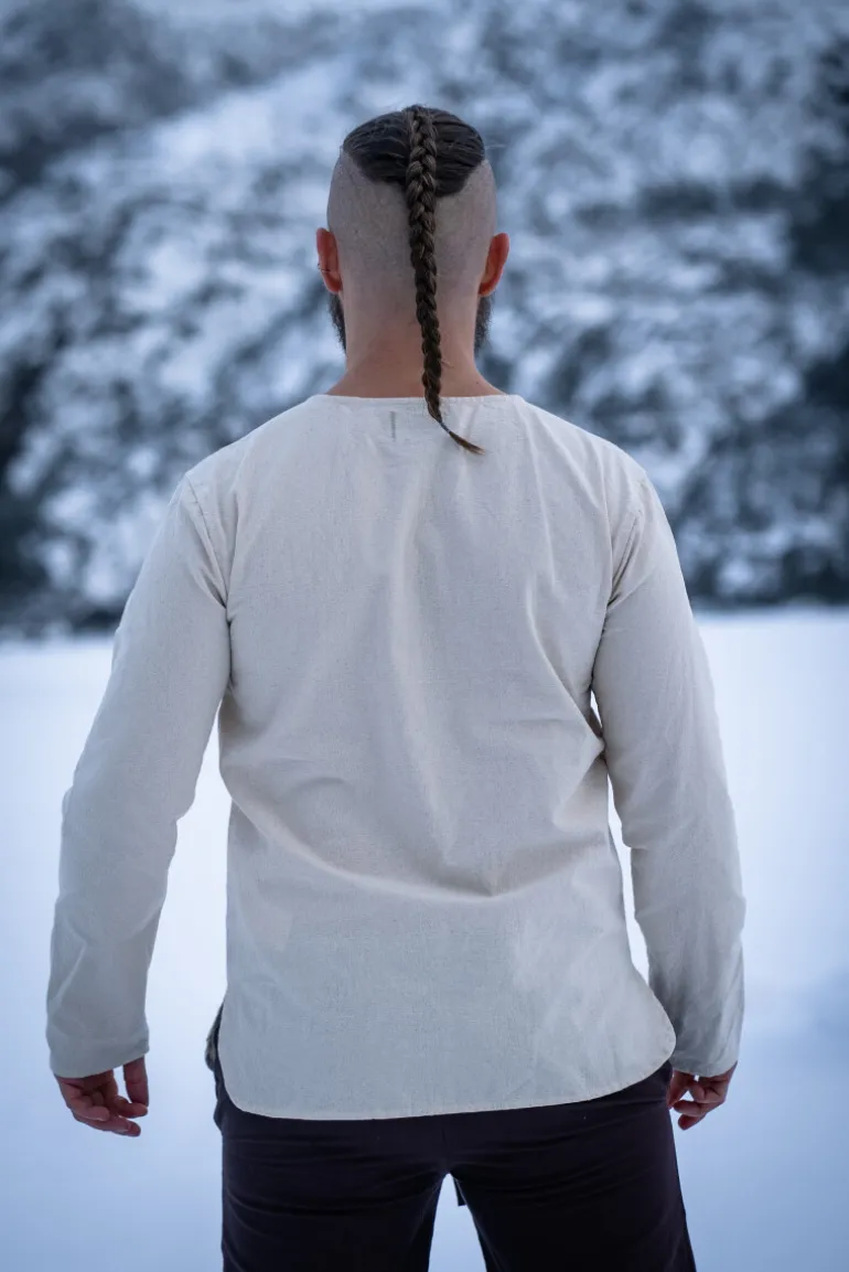 Unser Mittelalter Hemd Elfriede von Leonardo Carbone ist die perfekte Wahl für alle, die sich in die Welt vergangener Zeiten entführen lassen möchten. Mit seiner eleganten Bordüre im Halsbereich und den seitlichen 10 cm langen Schlitzen vereint es Komfort und stilvolles Design. Die lockere Passform und das weiche Baumwollmaterial sorgen für ein angenehmes Tragegefühl, während der V-Ausschnitt mit Schnürung dem Hemd eine raffinierte Note verleiht. Egal ob Du Dich auf ein LARP-Event begibst oder einfach Deinen Alltag mit einem Hauch Geschichte bereichern möchtest – dieses Hemd begleitet Dich stilvoll.