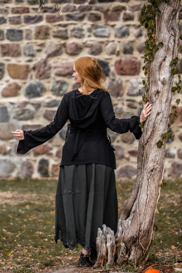 Unser geschnürtes Oberteil Lea mit Kapuze ist die perfekte Wahl für all jene, die sich in die magische Welt des Mittelalters versetzen möchten. Mit ihrer Bändelschnürung an der Vorderseite und den Seiten verleiht diese Bluse Deinem Look einen Hauch von Geheimnis und Eleganz. Die lange, spitz zulaufende Kapuze und die asymmetrische Silhouette mit dem leicht verlängerten Rücken schaffen ein einzigartiges Erscheinungsbild. Der körpernahe Schnitt im Brustbereich und die sich nach unten hin erweiternde Form sorgen für optimalen Komfort auf Deinen epischen Abenteuern.