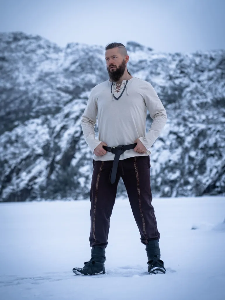 Unser Mittelalter Hemd Elfriede von Leonardo Carbone ist die perfekte Wahl für alle, die sich in die Welt vergangener Zeiten entführen lassen möchten. Mit seiner eleganten Bordüre im Halsbereich und den seitlichen 10 cm langen Schlitzen vereint es Komfort und stilvolles Design. Die lockere Passform und das weiche Baumwollmaterial sorgen für ein angenehmes Tragegefühl, während der V-Ausschnitt mit Schnürung dem Hemd eine raffinierte Note verleiht. Egal ob Du Dich auf ein LARP-Event begibst oder einfach Deinen Alltag mit einem Hauch Geschichte bereichern möchtest – dieses Hemd begleitet Dich stilvoll.