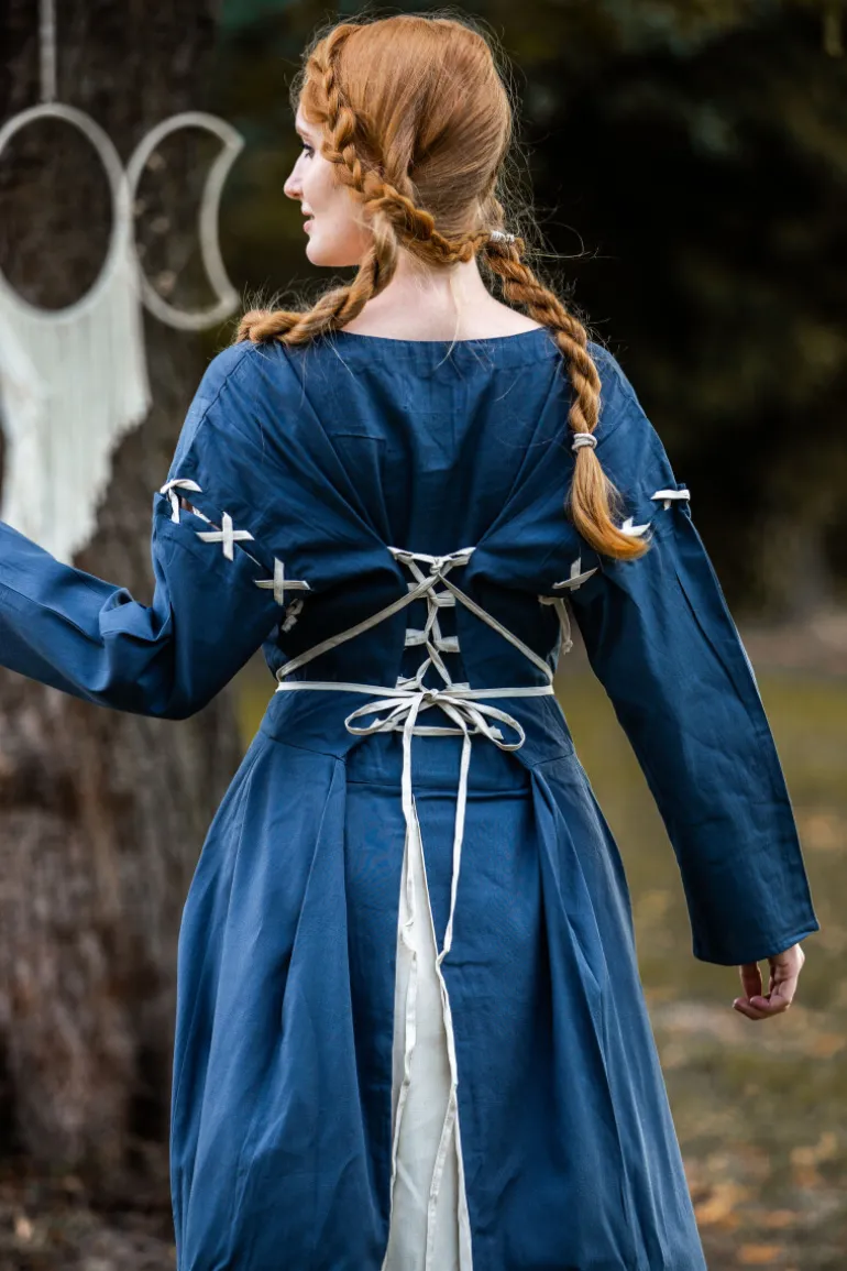 Dieses Kleid ist inspiriert von den prächtigen Gewändern der mittelalterlichen Adligen, die für ihre aufwendigen Designs bekannt waren. In einer Zeit, in der Kleidung nicht nur Mode war, sondern auch Status symbolisierte, könnte ein solches Kleid bei festlichen Anlässen getragen worden sein. Die Details wie die Schnürungen und der doppelte Stoff sprechen von einer Geschichte des handwerklichen Geschicks und des künstlerischen Ausdrucks.